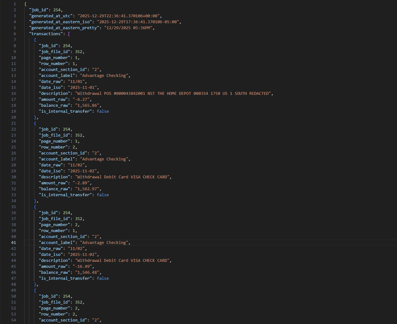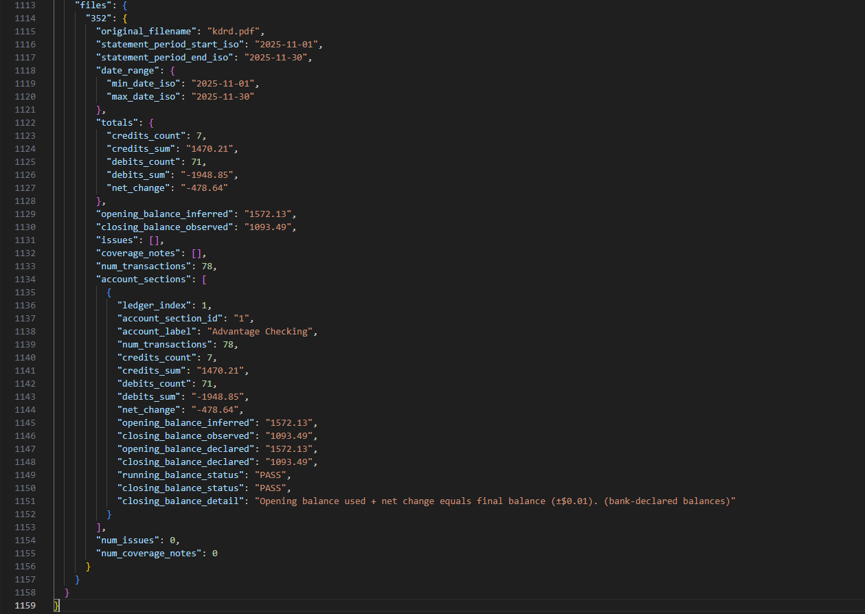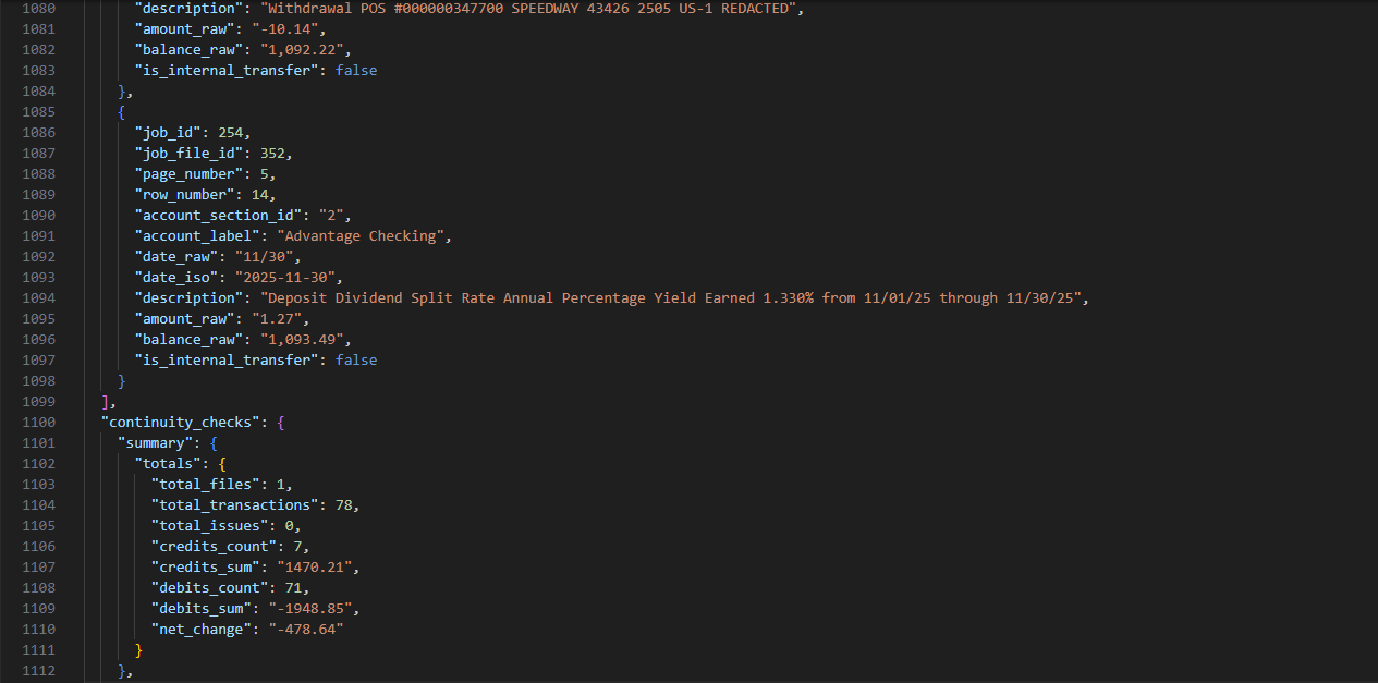 Outputs vary by bank format. Bank Statement Audit focuses on deterministic extraction and reconciliation checks.
